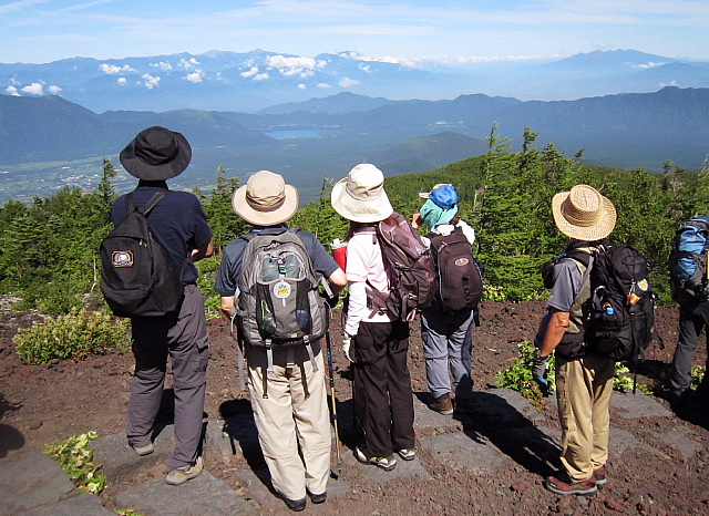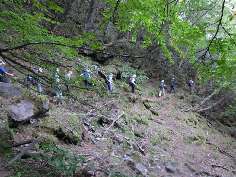 | 午前6時、マイクロバスは静岡駅を出発、清水ICから東名御殿場ICへと走行する。雲ひとつない快晴で、車窓から富士山も鮮明に望め、今日の山行に期待が高まる。御殿場から東富士五湖道路を経てスバルラインへ、スバルラインでは何台か登行する自転車を追い越した。ちなみに自転車の通行料は往復200円だそうである。スバルライン途中から、5合目駐車場を目指す乗用車で渋滞が始まった。バスは優先的に走行できてよかった。8時45分に奥庭駐車場に到着、日差しは強いが標高2240mの風は心地良い。9時5分、ここからお中道に向けて登りを開始する。 9時30分にお中道へ合流、しばらく進むと視界が開けた。南アルプスの大展望である。「あれが北岳」、「あれが赤石岳」等々声が飛び交う。南アルプスの右に八ヶ岳、そして奥秩父が連なっている。これだから山はやめられない。素晴らしい景観に皆々感動した。大展望の余韻に浸りながら、反時計回りに大沢崩れを目指す。ダケカンバ、ナナカマド、コメツガ等の亜高山帯の樹林の中を進む。シャクナゲも密生している。所々、高山植物も咲いている。黄色い花、赤い花、紫の花・・・あとで聞いたところによると、メイゲツソウ、オンタデ、ヒメシャジン、ベニバナイチヤクソウ等であった。滑沢、仏石流し、一番沢等の沢を通過し、10時50分に大沢崩れに到着した。 標高約2300m。ここには国土交通省の作業小屋があるが、大沢崩れを眼前に眺めるには、なお5分ほど下る必要がある。皆、そこまで行ったが、残念ながらガスが立ち込めていて、大沢崩れの全貌を見ることはできなかった。 |