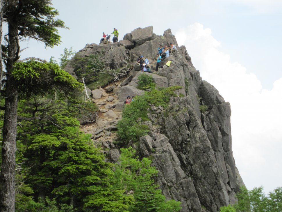 く樹林帯を抜け山頂下の岩場に到着する。岩を登って2352mニュウに到着。