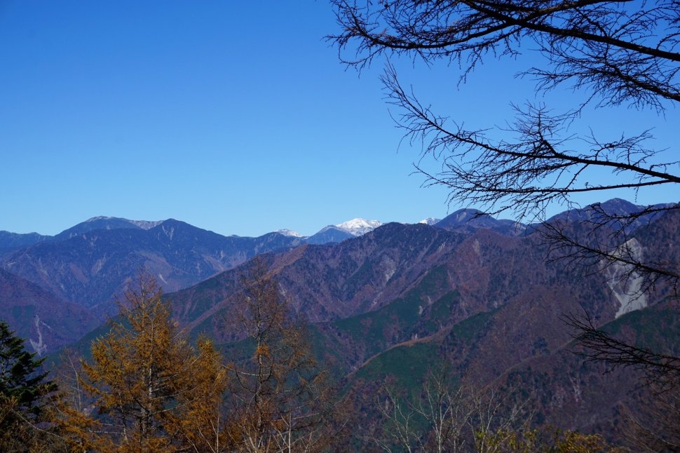 沢口山 参加者:23名(男性9名、女性14名) リーダー:服部 記録:TI 寸又峡温泉をぐるりと取り囲む寸又三山の一つ、沢口山に秋の紅葉を眺めながら登る。 6:00 静岡駅南口バス乗り場を出発。島田駅を経由して大井川沿いに北上する。 8:20 寸又峡温泉駐車場到着。思ったより寒くはないが吐く息が白い。紅葉目的の観光 客で温泉街は混雑している。 8:30 駐車場出発。雲一つない快晴で無風だ。 8:50 登山口到着。 9:20 標高750mの尾根上に到着。登山口からここまでは高低差200mの急こう配 で、登り始めの体にはこたえる急登だ。 10:15 展望所到着。 寸又川対岸の山々の山肌が一面紅葉で思わず息をのむ。藁科川源 流の七ツ峰や富士山の眺望が青空のもと素晴らしい。 10:40 木馬の段到着。木馬と書いてキンマと読むそうだ。服部リーダーの話では、そ の昔、山から伐採した木材をここから山下に向けて落としたとの事。かなりの急 斜面である。 11:00 富士見平到着。ここは下山路との分岐点だ。木馬の段からここまではかなりの 急勾配で息が切れるが、ここから先はなだらかな尾根が続く。 11:20 水ナラの大木に到着。幹回りが6.5mもある見上げるばかりの大木であるが、残 念ながら枯れている。 11:40 沢口山々頂到着。雪をまとった南アルプス南部の聖岳から光岳の峰々。そして 深南部の山々が一望できる。東には雪化粧をした富士山も木々の間から顔を覗か せている。 12:30 出発。登るときは気付かなかったが、コメツガ、水ナラ、ヒメシャラの大木が いたる所に自生していて中々見ごたえがある。 12:55 富士見平の分岐に到着。ここから往路とは別の道を下る。 13:45 展望台到着。分岐からここ迄は急勾配の道が続き、疲れた足や膝にこたえる。 14:00 鉄塔到着。ここ迄は杉、ヒノキの暗い人工林の中の道が続いたが、急に視界が 開けてホッとひと息つく。 14:35 駐車場到着。予定よりかなり早く到着した。相変わらず観光客で混雑している。 16:50 島田駅着 17:40 静岡駅着 (感想) 息を?むほど見事な紅葉の中、静かな山歩きが出来て期待以上の登山だった。 リーダーの服部さんとサブリーダーの青木さん。ありがとうございました。 (TA)
