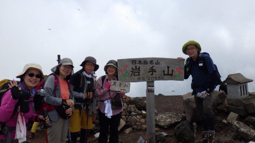 【岩手山】男性3名、女性10名計13名 岩手県の最高峰、標高2,038メートルの秀峰「岩手山」。 今回は、岩手山登山の中でも最もポピュラーと言われる馬返し登山口からスタート。 参加者のほとんどが岩手山は初めてであり、急こう配の山道が続きかなりの困難が予想 された中、後行班に八合目で引き返した人がいたものの、皆怪我もなく無事に下山。 天候にも恵まれ、活火山の荒々しさや高山植物、可憐な花など岩手山の様々な魅力を満 喫し、苦労した中にも達成感を味わえた山行であった。 6:40 馬返し登山口。木々に覆われた山道を一列にスタート。 7:30 一合目。急勾配で歩きづらく、隊列が伸びてきたため、全体を先行班(6名)・ 後行班(7名)の 2班に分け、 それぞれのスピードに合わせて進む。 8:25 四合目(先行班)。樹林帯の新道から岩場の多い旧道に挑戦。眼下に拡がる大 展望を楽しみながらも、浮石にも気を付けながら慎重に進む。 10:15 八合目避難小屋(先行班)。 広々した平地にどっしりと構えた木造の立派な建 物が目に飛び込む。建物の正面には水場があり、疲れを癒す多くの登山客で賑わってい た。水は非常に冷たく、水量も豊富、まさに砂漠のオアシスであり、30分ほど休憩。 11:45 山頂(先行班)。 山頂標識を囲み皆で記念写真を撮れば、ここまでの疲れもな んのその。山頂では、沸き立 つ雲海の雄大な景色の中、点在する石造物にも目をやり ながら、最後は砂走に足を取られながらも、空中 散策の気分で、反時計回りにお鉢巡 りを楽しんだ。